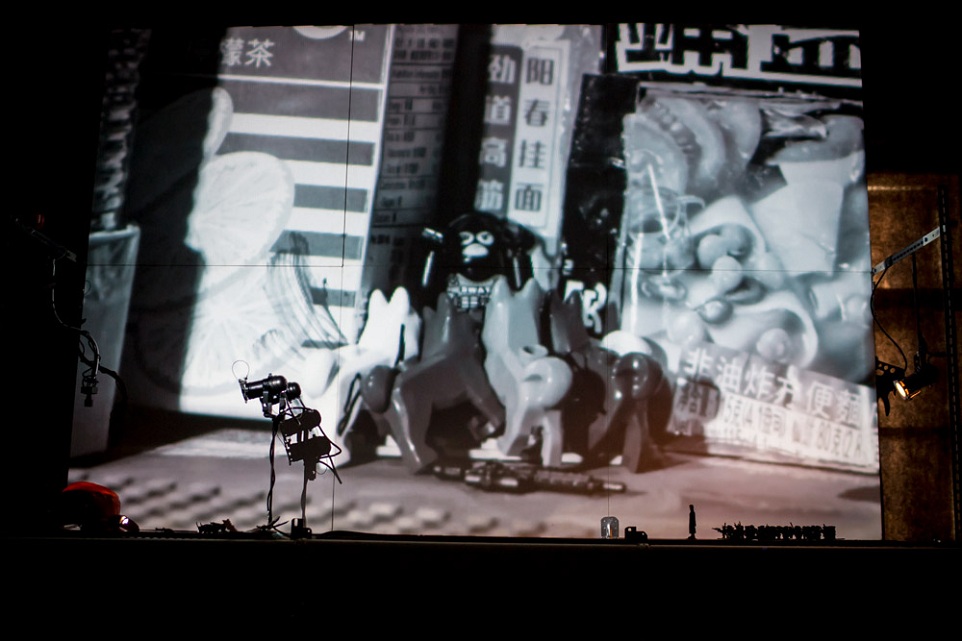 Vzniklá konfrontace má černobílý komiksový styl inspirovaný japonským anime, který jí dodává nadsázku i temné napětí. Autoři využívají princip live-cinema, kdy částečně kombinují komiksové video s dokumentárními filmovými záběry skutečnosti v Hong-kongu, a především s živou loutkovou animací v reálném čase. Zajímavé je bezpochyby scénografické řešení projekce, jejíž variabilitu zajišťuje rozebíratelná stěna z bílých panelů. To dává možnost formovat prostor projekce podle potřeby a zároveň i vymezuje prostor pro technické zázemí.