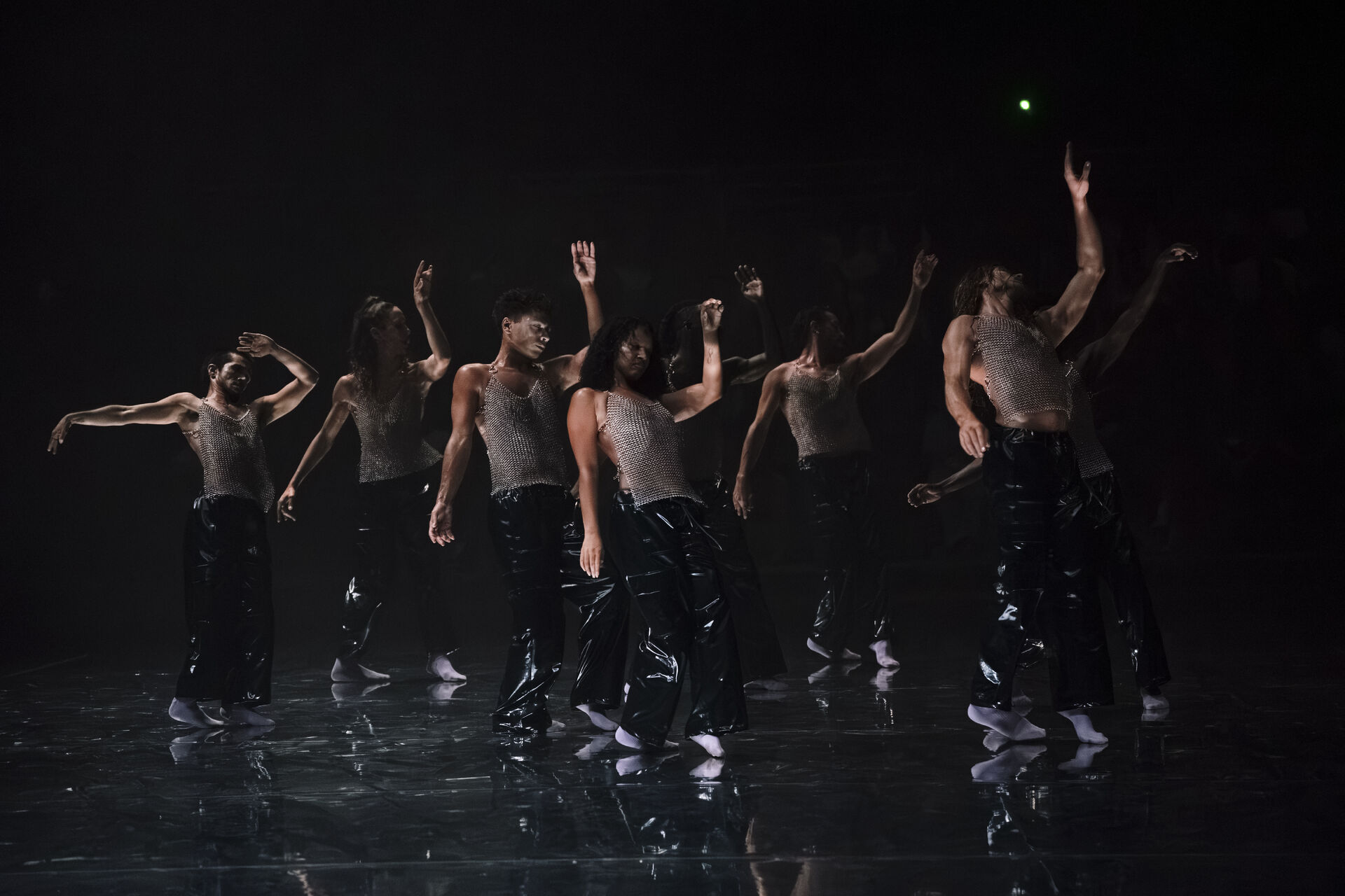 If the Défilé plays at togetherness in the streets, the stage also kept returning to the collective. Take Gisèle Vienne’s Crowd. On entering the vast hangar of Les Grandes Locos, iron beams, holes in the floor, industrial scars, I felt the irony: a rave inside a warehouse, yes, but one that you access by car, like a supermarket. Vienne’s rave is in slow motion: hoodies, jeans, 1990s silhouettes caught in suspension, gestures stretched until time buckles. Moments are hypnotic, images arresting, but the collective fails to throb. Instead of sweat and friction, we get fragments and polite distances. What was once urgent in 2017 now reads as archaeological: the rave as relic. Still beautiful, but embalmed. The youth on stage looks borrowed from MTV reruns, not from the fractured, ironic, self-archiving dances of today.