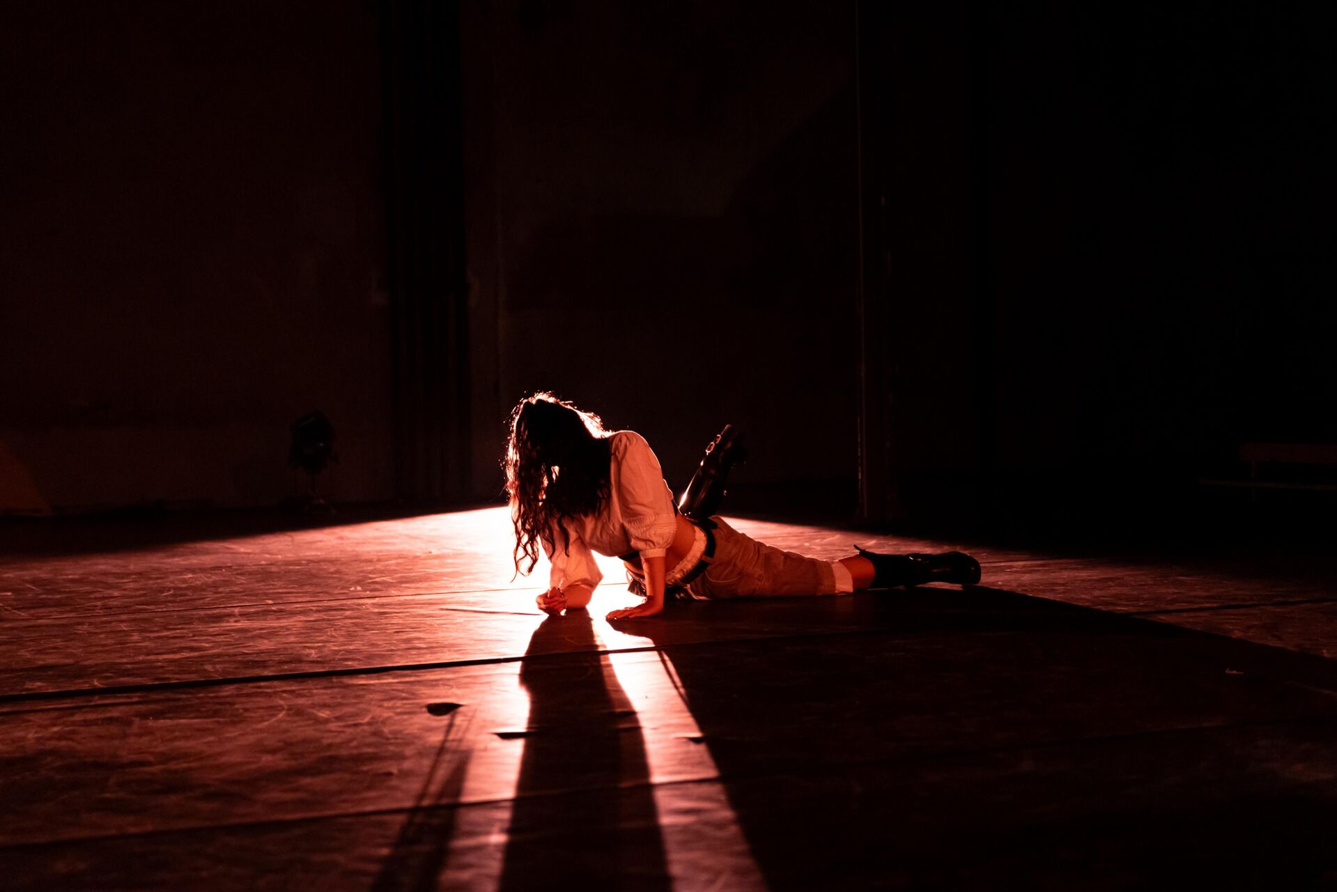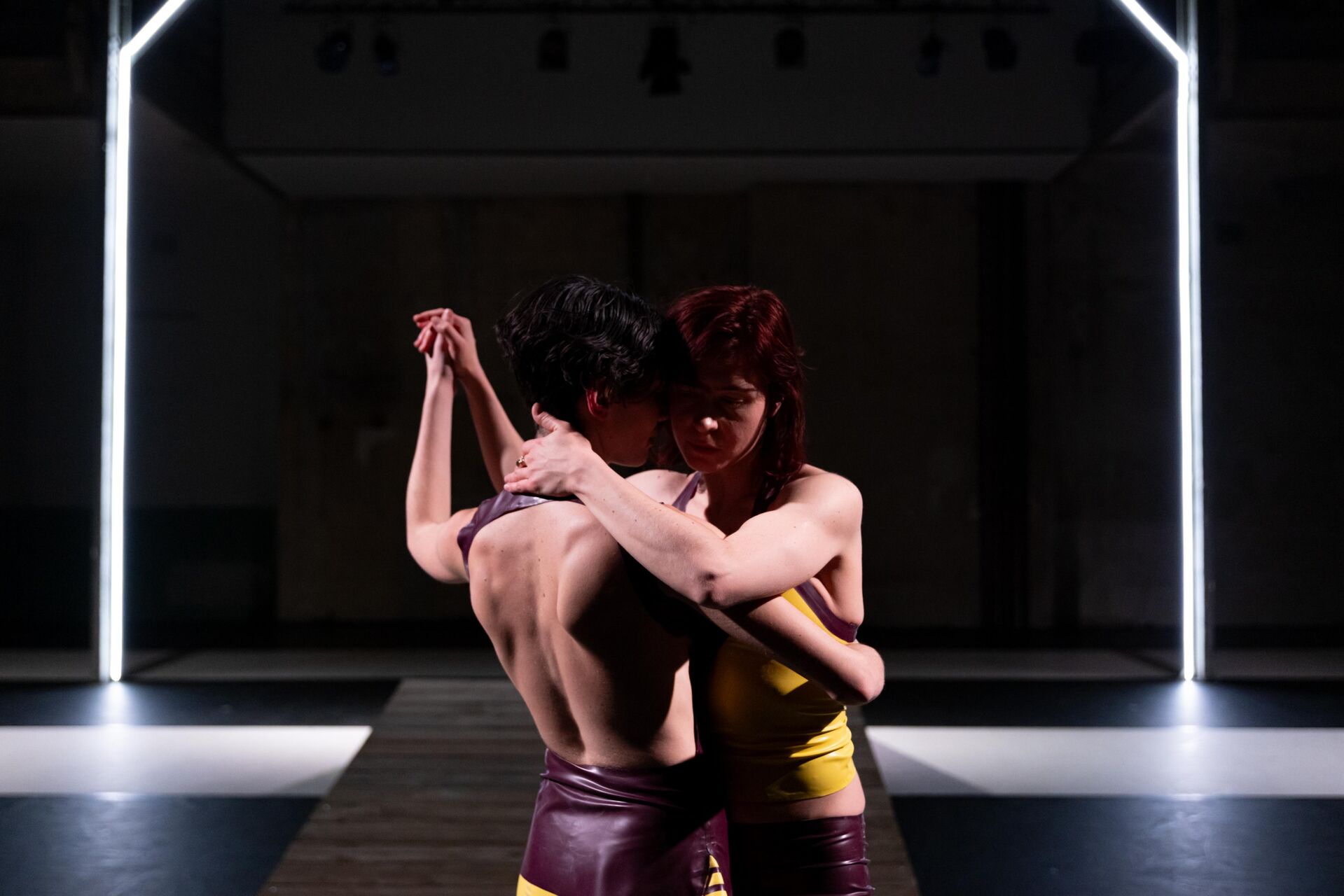 For much of the performance, the dancers remain physically separate, resonating in absentia. Runs, crossings, and repeated gestures modulate the tempo and intensity, while warm light from beneath the platform destabilizes the boundary between intimacy and visibility. Everyday actions intertwine with narrative fragments and references to Italian culture, as in cinema, while the myth of Orpheus and Eurydice operates as an undercurrent, informing choices around delay, fleeting glances, and the impossibility of fusion. The final section offers brief moments of contact, accentuating the fragility of attunement. Interpersonal space becomes the primary site of reflection — a deliberate negotiation of co-presence as precarious achievement.