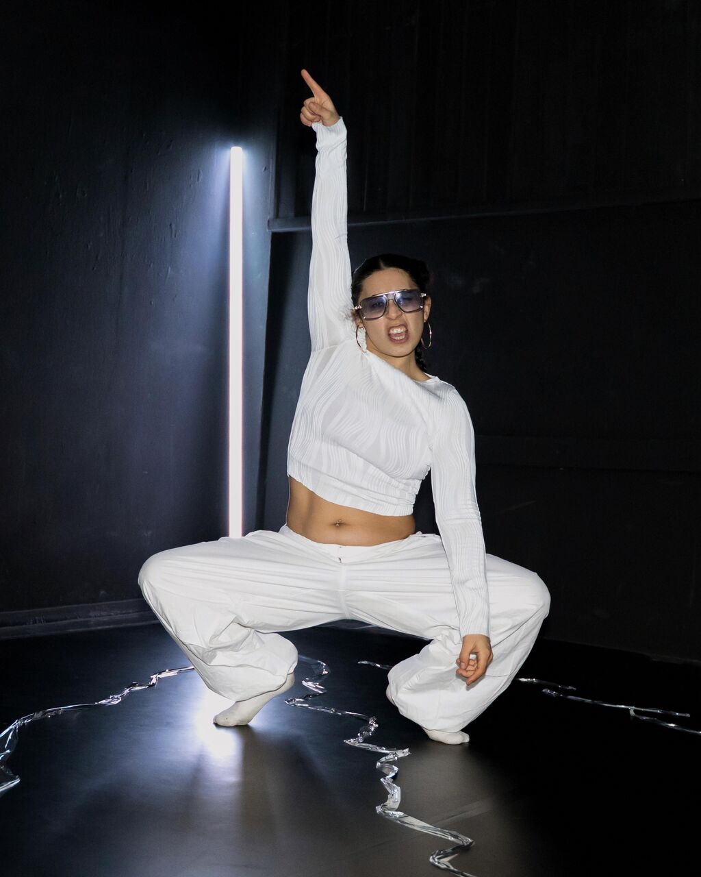 Addressing the audience, she asks: “How can I sell a dance? How much would you pay for a movement? Can I pay my rent with this dance?” A militaristic “attention” gesture contrasts with dance movement. This is a critique of systems that legitimize discipline and war while devaluing embodied labour. Movement softens and expands across the stage, then pauses for a tender, bittersweet phone call in which Moraga recounts her migrant path, questioning whether this performance is a gig or another “shitty job.” The piece closes with reggaeton, both invoking and reclaiming a stereotyped form of cultural salvation.