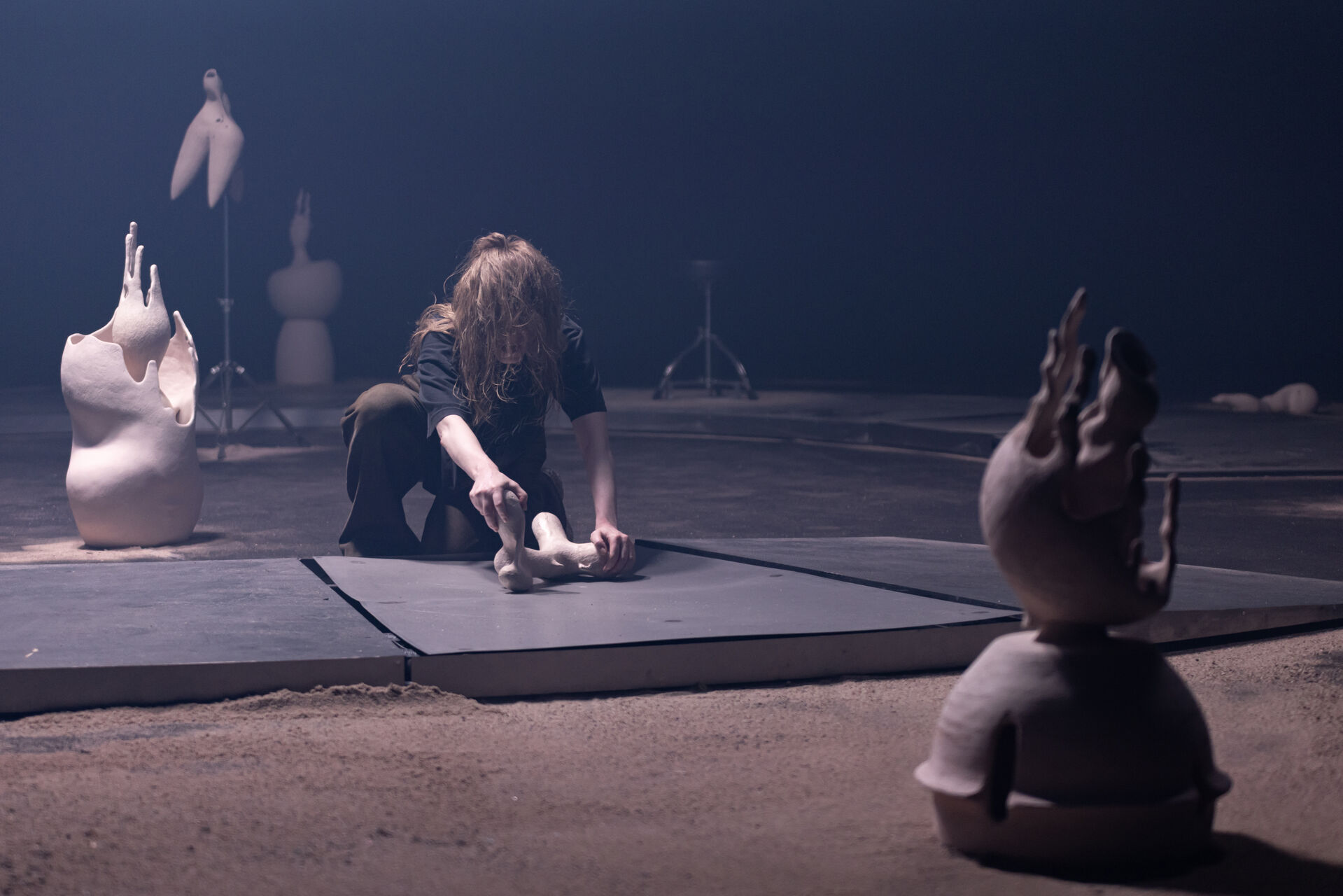 MoonJar by choreographer and performer Kat Válastur and composer Aho Ssan transforms HAU2 into a ceremonial space where choreography, architecture, and materials converge. Terracotta (by Latika Nehra), sand, and a circular platform create ritualized intensity through material discovery, gestures of picking, animating, or placing small ceramic figures — relics, bones, fragments of imagined archaeology, and occasionally votive statues. Movements are circular, broken, and repeated, echoing lunar cycles, DNA spirals, and geological time. Persistence, insistence, and meticulous engagement dominate over fluidity. The body mediates relations between human and non-human matter, memory, and temporality.