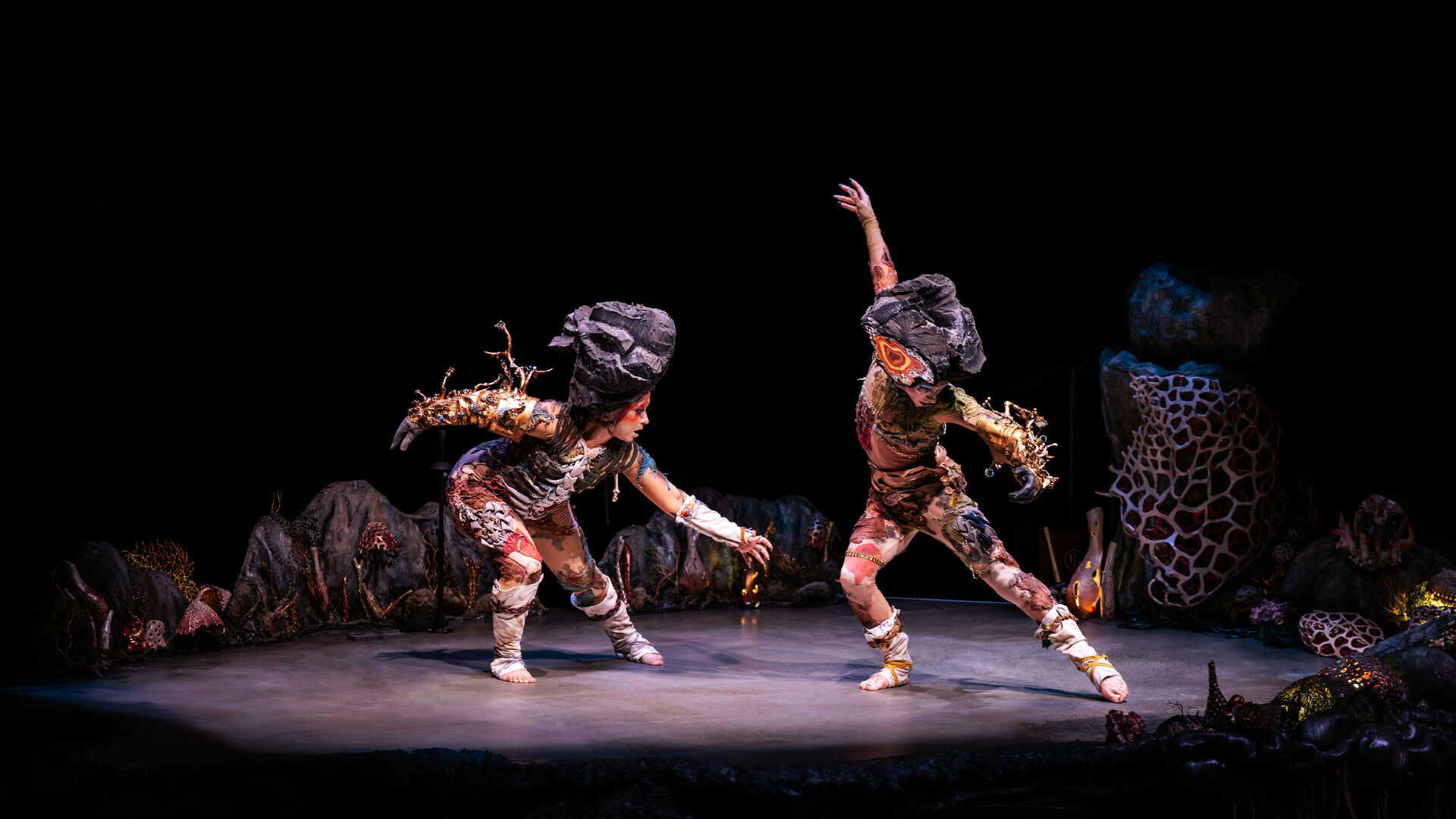 Atop and around a monumental, jutting rockface, held up by ornate yet seemingly crumbling sculpted columns, co-performers and creators Chaignaud and Argentine singer-songwriter Nadia Larcher (with musical and stage direction by Nina Laisné) dance together in a courtly fashion and serenade each other in Spanish. They are accompanied by a troupe of musicians whose brassy melodies oscillate between the mournful and the celebratory.