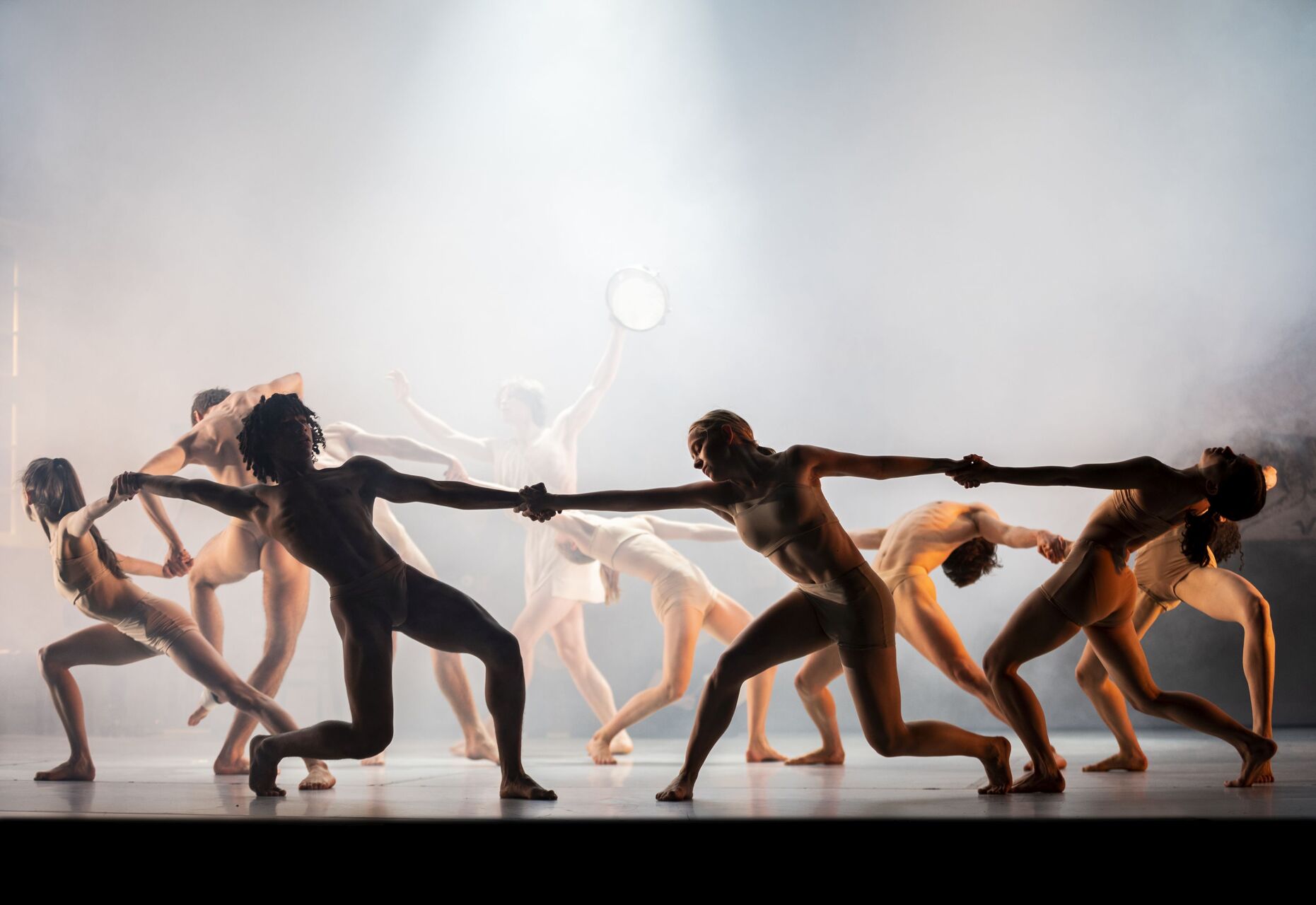 The young dancers are endlessly impressive, alternating seamlessly between classical ballet steps and expressionist dance–inspired contractions, releases, and floorwork. Yet the work’s hyper realistic style and frequent use of earnest narration makes it feel like a saccharine Disney-style retelling of German dance history. Rudolf von Laban emerging from a cloud of smoke to a Middle Eastern score, wearing a white robe like the Jesus of dance, is particularly cartoonish. Scenes in which dancers march onstage in Hitler Youth costumes, semaphoring their arms while others drift like ghosts in striped concentration camp uniforms, also feel heavy-handed.