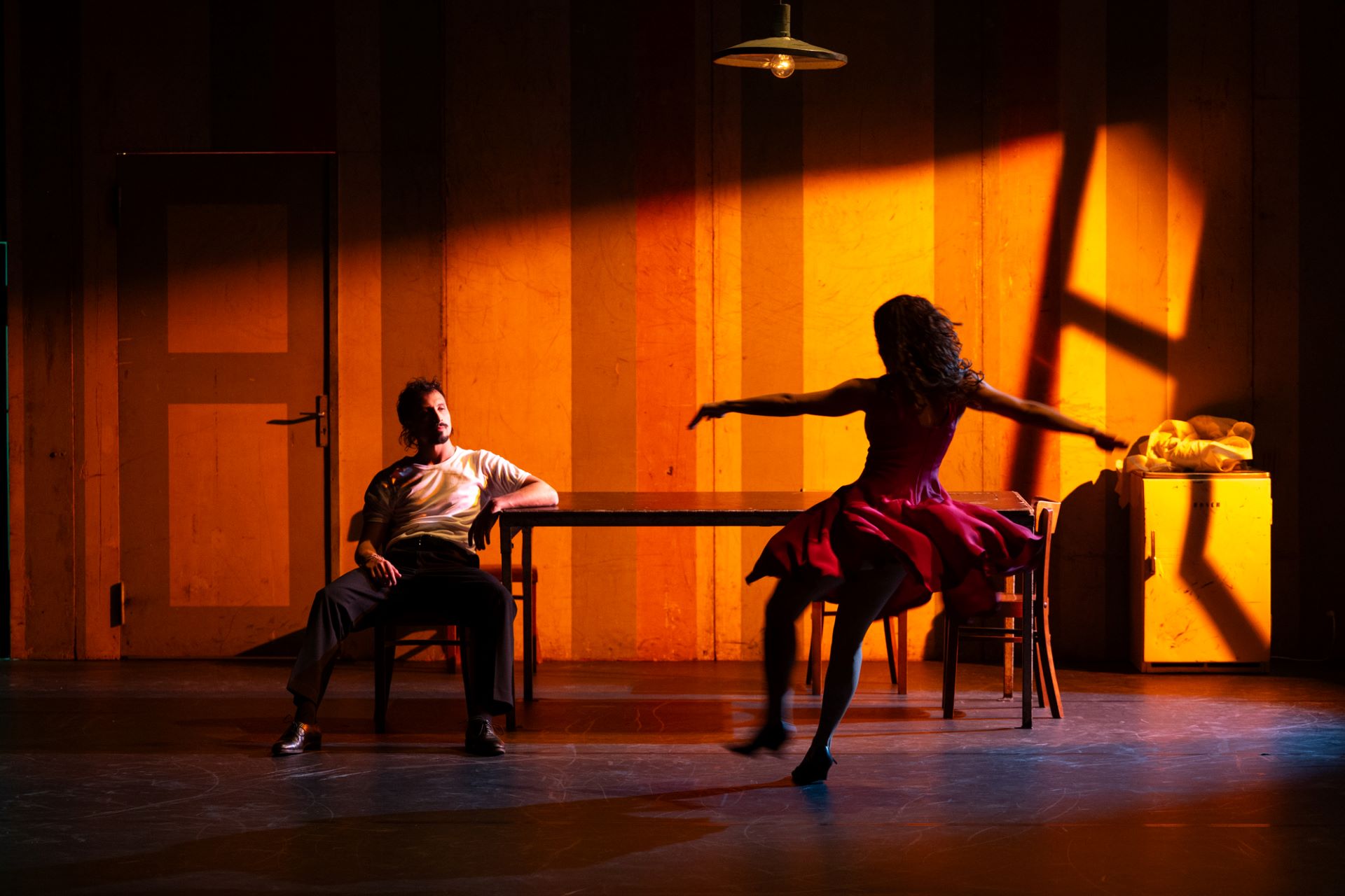 While described as a “timeless” audience favourite on the Radialsystem's website, there are elements that haven’t aged well—particularly a scene that uses Argentine tango to depict domestic violence. A moustachioed man in a white vest throws his red-dressed partner onto a table, thrusting his pelvis towards her, while she flinches and recoils from kicks and grabs. Not only does it raise questions about the necessity of depicting violence against women on stage—the scene seeming to exist purely for dramatic effect rather than broader comment—but also about doing so by employing cultural stereotypes, in this case reductive notions of Latin machismo.