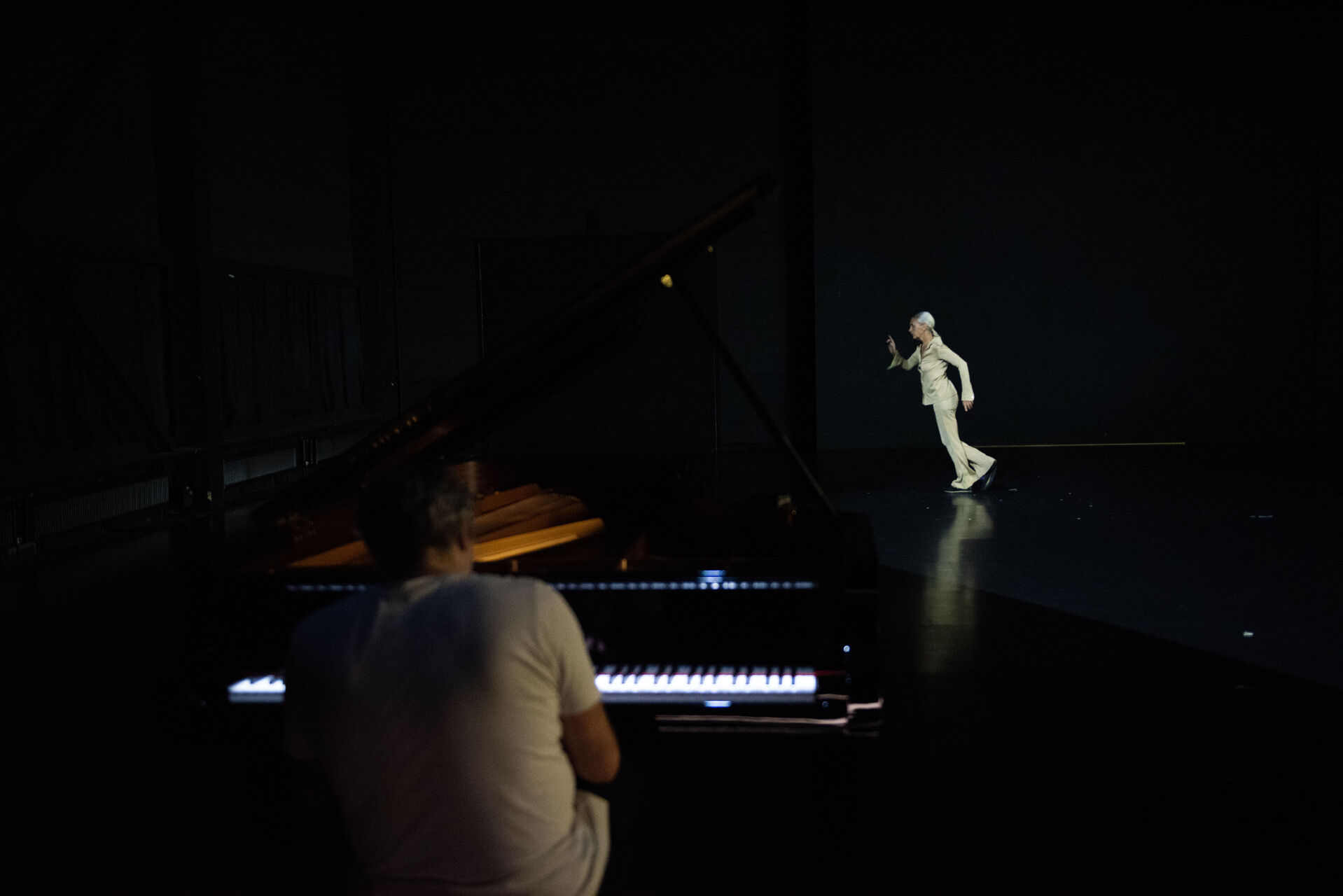 Accompanied by the calm, rippling tones of onstage pianist Alain Franco performing Bach’s titular score, the Belgian postmodern dance pioneer navigates the softly illuminated space, arms outstretched like compass needles, legs swinging like pendulums, her torso twisting like a corkscrew. The sharpness of De Keersmaeker’s exhales and jittery changes of direction frame her movement as serious, earnest work, underscoring her decades-long devotion to craft. Yet moments of hopscotchy skips, cheeky bounces, and irreverent poses cut through this rigor, reminding us De Keersmaeker’s practice is borne of not only precision but playfulness. That she continues to perform at 65 is unusual; that she remains utterly captivating is undeniable.