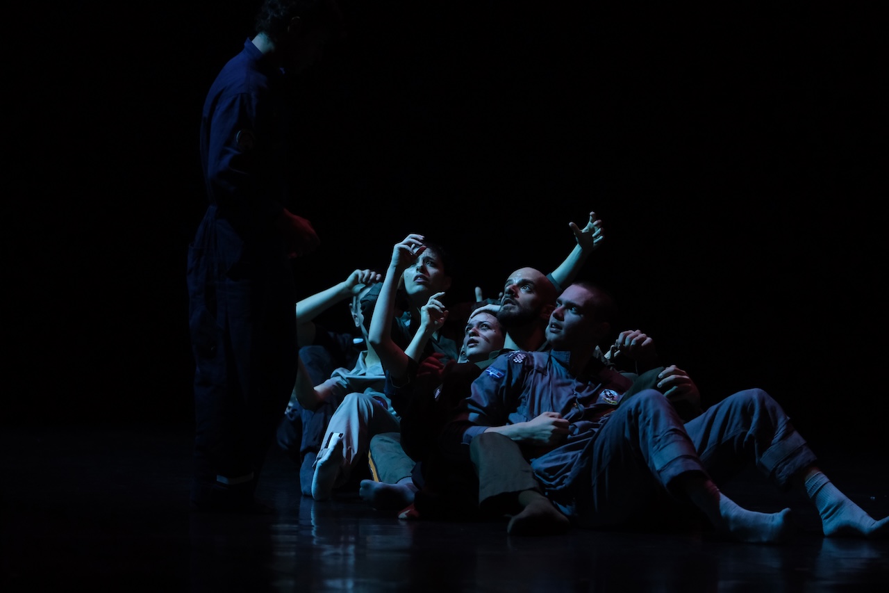 Evoking surprise, shock, or impression encapsulated in the everyday use of the phrase “holy shit”, Astolfi’s Holly Shifttakes a step further to reflect on the moment of personal or cosmic shifts. Leaving behind the lightness of Ansa and Bacovich, the work introduces a dark atmosphere of wonder and quest, enhanced by Marco Policastro’s light design and Davidson Jaconella’s original soundscape – at once soothing and unsettling, atmospheric and earthy. Dressed in earthy-coloured, military-style uniforms (costume design by Anna Coluccia), the dancers become entangled, climb on each other’s shoulders to construct human ladders or manipulate each other in urgency, looking to understand each other as human beings. Their bodies seem liquid, almost boneless, exhibiting a dynamic affirmation of their presence in space; they move spasmodically or often in an animalistic – if not instinctive – manner, embracing syncopation while expressing angst. Astolfi’s Holly Shift, a transfixing experience as a whole, embodies resistance and the fear of changing when everything deepens in a comfortable stagnation, conveying disorientation, necessary before taking a significant and unfamiliar step into the unknown.