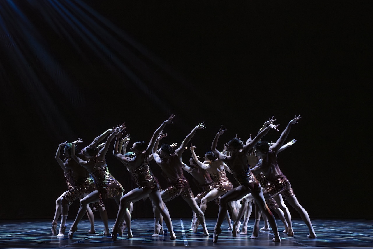 Moving away from the contrast between the seasons of spring and fall/autumn and the metaphors that may evoke, the second part of the triptych opened with Echoes from a Restless Soul, a piece originally made by Godani for the Ballet Frankfurt in 2016. Godani, a leading soloist for William Forsythe’s Ballet Frankfurt, was the first to succeed him as the director of the by then renamed “Dresden Frankfurt Ballet Company”. Contrasting Neumeier’s white hues of purity, Echoes from a Restless Soul introduces a darker mood, intensified by Maurice Ravel’s Gaspard de la Nuit, performed live on stage by pianist Massimo Spada. The atmosphere is evocative of the bottom of an aquarium or the deep dark sea where only a few rays of sunlight may reach — indeed the light, as well as the shiny costumes, reminiscent of fish skin, both designed by Godani, reinforce this aquatic image. Abandoning Neumeier’s linearity, the dancers perform a dance vocabulary that enriches the ballet technique with undulating, wavy motions, accentuated by the expressivity of their bare arms and legs and combined with a rapid tempo. Moving together or separately, the dancers contract and expand the space; within this continuous transformation of the immaterial space, Jacopo Giarda affirms once more a powerful presence in roles that demand a dynamic approach to movement. Godani’s Echoes from a Restless Soul succeeds in hypnotizing the audience with restless choreography infused with mystery and obsession.