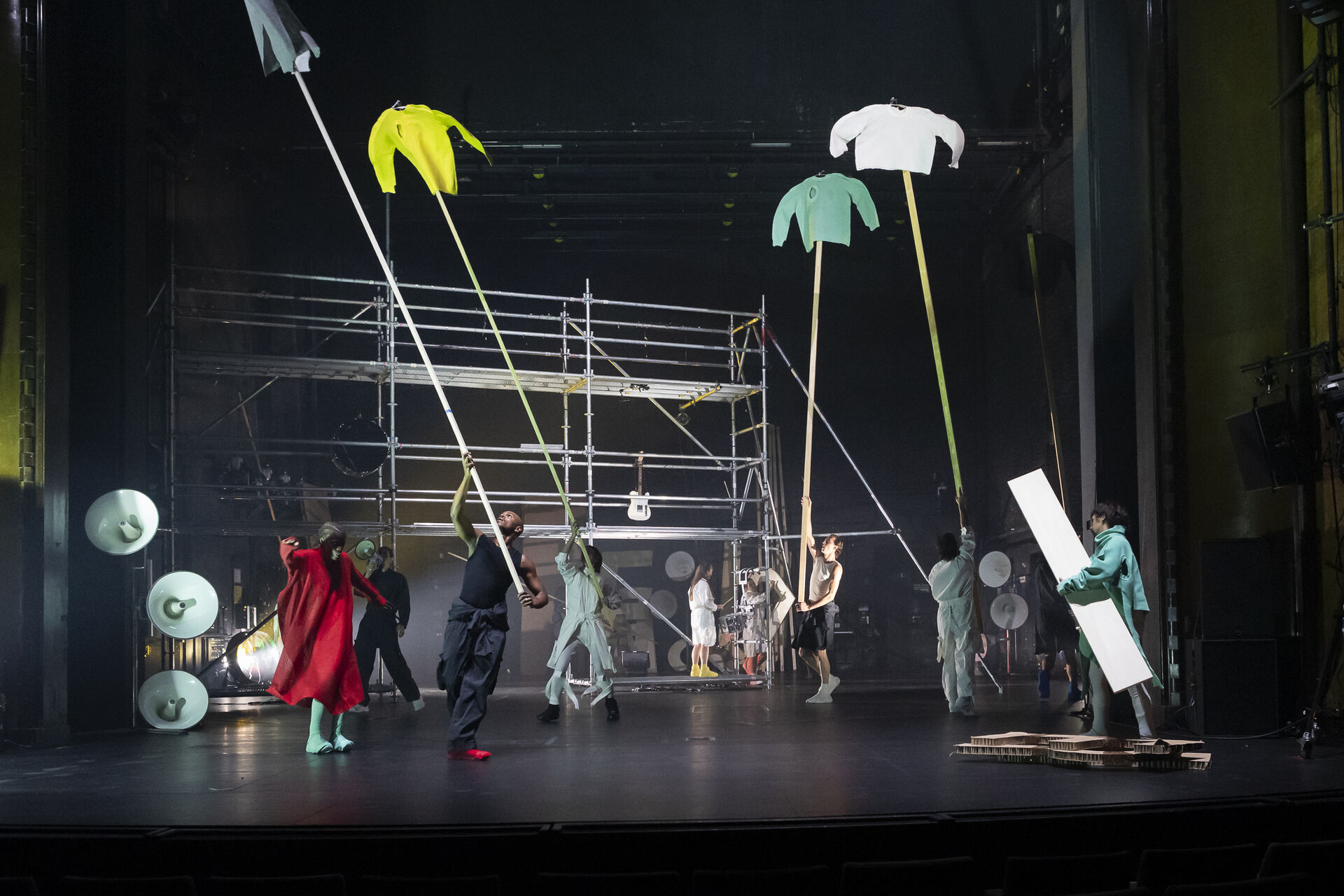 The performance’s rhythm emerges from live music, which interacts with bodies and objects rather than merely accompanying them, generating a constantly morphing soundscape. Scenes become ephemeral ecosystems, where nothing remains unchanged. There are echoes of Théâtre du Radeau in the transformation of stage into visual thought, mingling with a dreamlike, Fellini-esque quality of ruins, construction sites, and wandering figures. Flouret balances urgent gesture with compositional precision, avoiding both chaotic rhetoric and disaster aesthetics. The result is a piece that never truly explodes—leaving the audience suspended, caught in the breath before the flash.