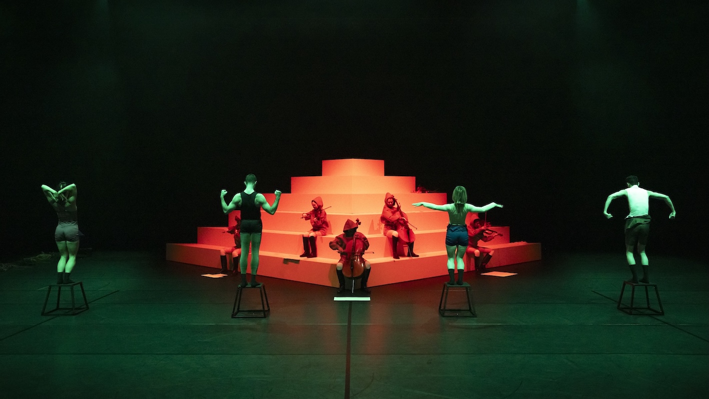 Braun’s score moves from dissonance to lyricism, creating a polymorphic symphony of buildup and rupture. Linder translates this energy into a choreography that alternates between elegance and nervousness, precision and abandon. The staircase, symbolizing ascent and hierarchy, becomes a playground of competition—a “tournament” of bodies and sounds vying for the centre. Dancers and musicians form a laboratory of mutual listening, a field of forces where formal order is constantly subverted by intrusions, noises, and sudden deviations. Throughout the performance, dance seems to dissolve into noise. Movements fracture, gestures echo sounds, generating an audiovisual experience that disrupts perception. It is a minor emotional earthquake, a destabilizing linear vision and inviting reflection on the very nature of harmony.