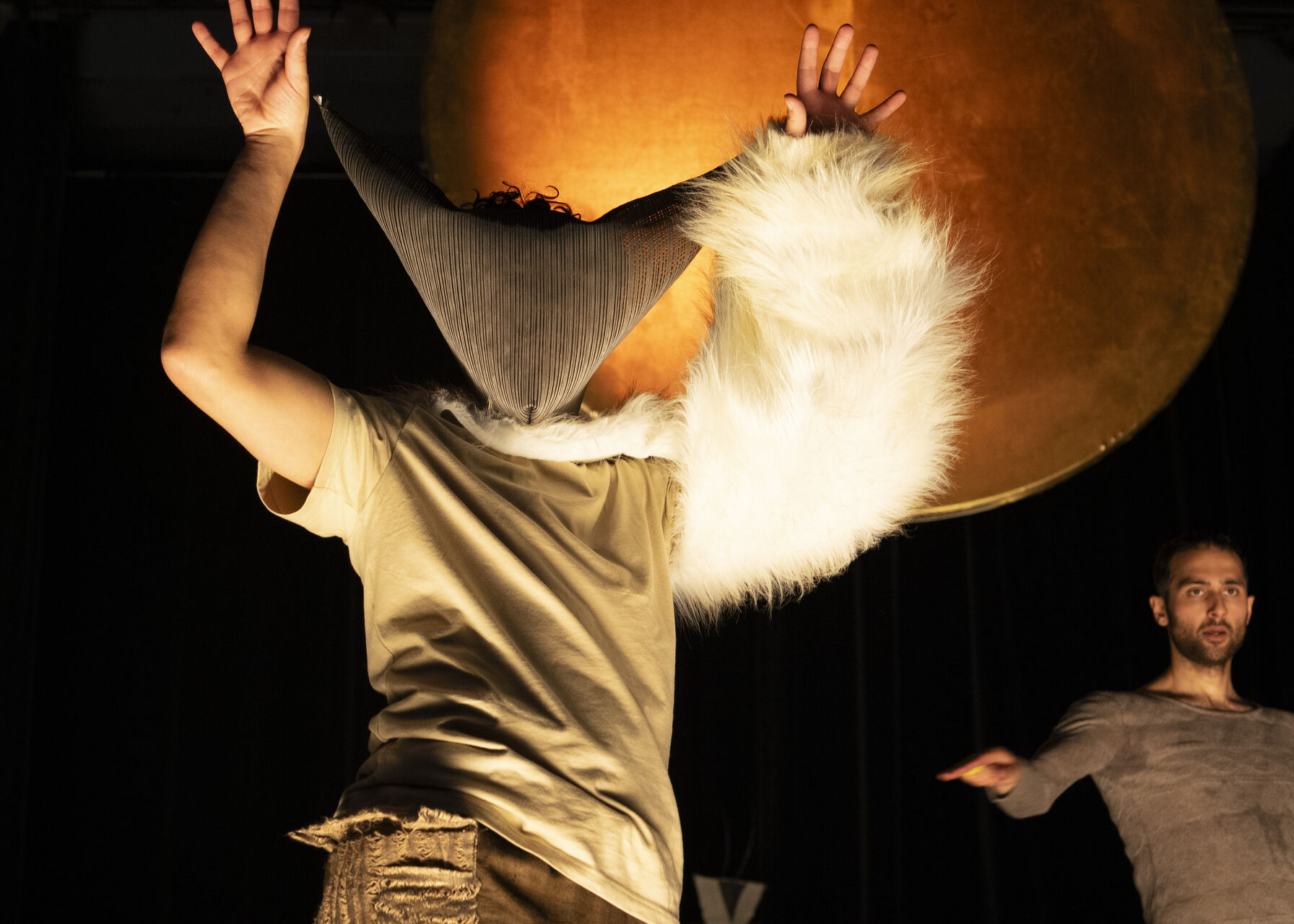 The scene glows in a warm, golden light, dominated by a large rotating disc that evokes the sun, moon, time, and movement. Performers wear colourful, architectural garments and large animal masks—foxes, antelopes—they burn incense and trace deliberate paths across the stage. The first part of the show is contemplative, with slow rhythms and geometric body formations that create ritual maps. Gradually, the liturgy transforms: a shaman-DJ begins mixing electronic, drum and bass, and hip-hop, performers remove their masks, movements quicken, bodies explode with energy. Dance shifts from meditative geometry to breakdance, from ritual circle to club, merging past and present, spirituality and pop culture. This tension reflects a society suspended between roots and modernity, memory and future. After the energetic climax, the group returns to the original circle: bodies regroup, male voices rise in slow song, gestures evoke animals and landscapes. The choreography closes its cycle, like a breath absorbed back into the earth.