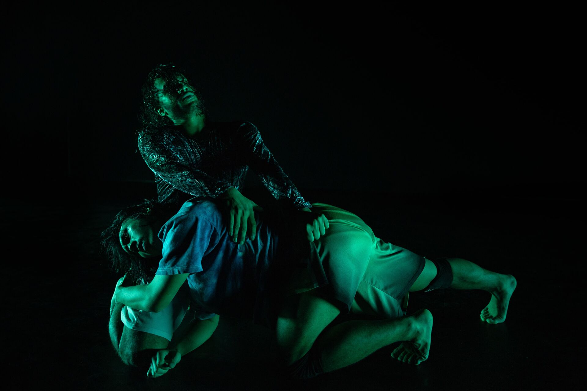 The festival’s first German premiere, Clara Furey’s UNARMOURED, opens with a quartet of queer artists laid bare—unarmoured, as the title suggests—exploring power, desire, and vulnerability. The performers inhabit a suspended, almost otherworldly space, bathed in milky green light that transforms the stage into a pulsating chamber. Bodies sway like waves, stretching toward collapse or recoiling in micro-movements, as if testing gravity itself. The effect is hypnotic: a collective breath shaping an intimate, unstable, profoundly human topography. Repetition becomes a dramaturgical device, each cycle of movement layering meaning.