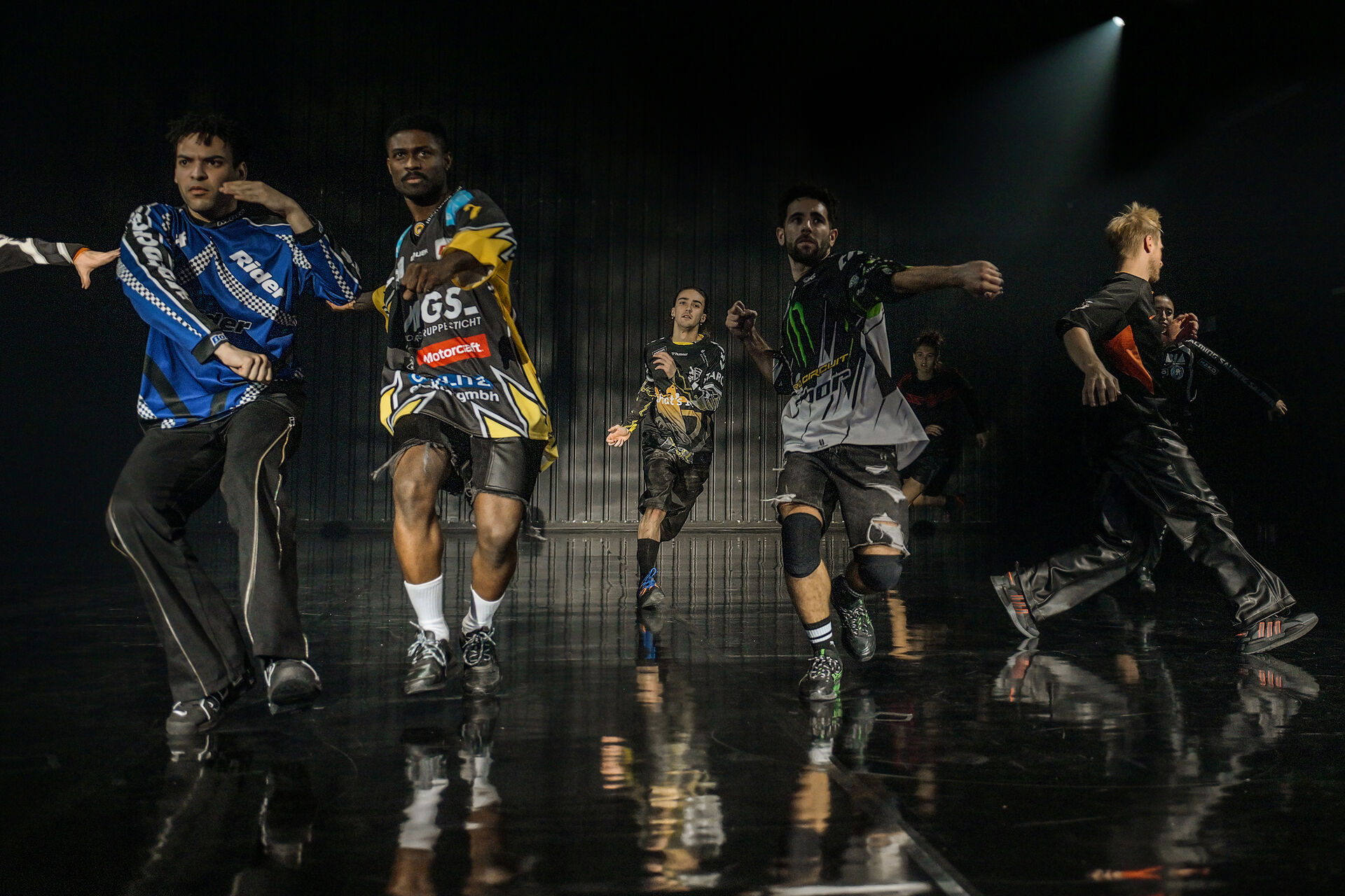TanzMainz dancers’ balletic precision merges with the ironic superficiality of contemporary language. Movements derived from social media—poses, scrolling, freezes—are extracted from their original context and presented as pure gestures alongside glitch-like, rewound, abstract forms, allowing dance to reflect on everyday life in a digital era. Despite visual density, Trailer Park maintains structural and musical clarity, alternating lightness with pathos, irony with melancholy, inviting the audience to observe our time with both critical distance and tender engagement with its confusion.
