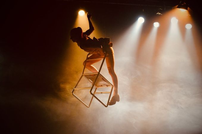 Have you ever confused a dream and reality? This question arose when I watch the first public production of Cirkus TeTy’s Narušení (Disturbance) in stage lights. It is an intro line from James Mangold’s eponymous movie with star actors, which uses the clients of a psychiatric retreat to observe the altered perception of reality. The duet of Pavla Rožníčková and Veronika Smolková did not directly refer to the movie or the famous theatre piece Šašek a královna (The Jester and the Queen), yet it generated the links through associations. The absurd framework and inner (lack of) logic made it possible not to strive for unequivocal understanding, be led, and observe the series of actions. Chairs were support and a reason to quarrel, provoke and implement the authority, and the only one was hanging in the space. The metal construction allowed innovative aerial variations that enticed “dreamy” surreal moments of aesthetic bliss in the haze full of light. Narušení (Disturbance) seemed to respectfully trigger naivety and playfulness, which has been typical for TeTy since the establishment of their company ten years ago.