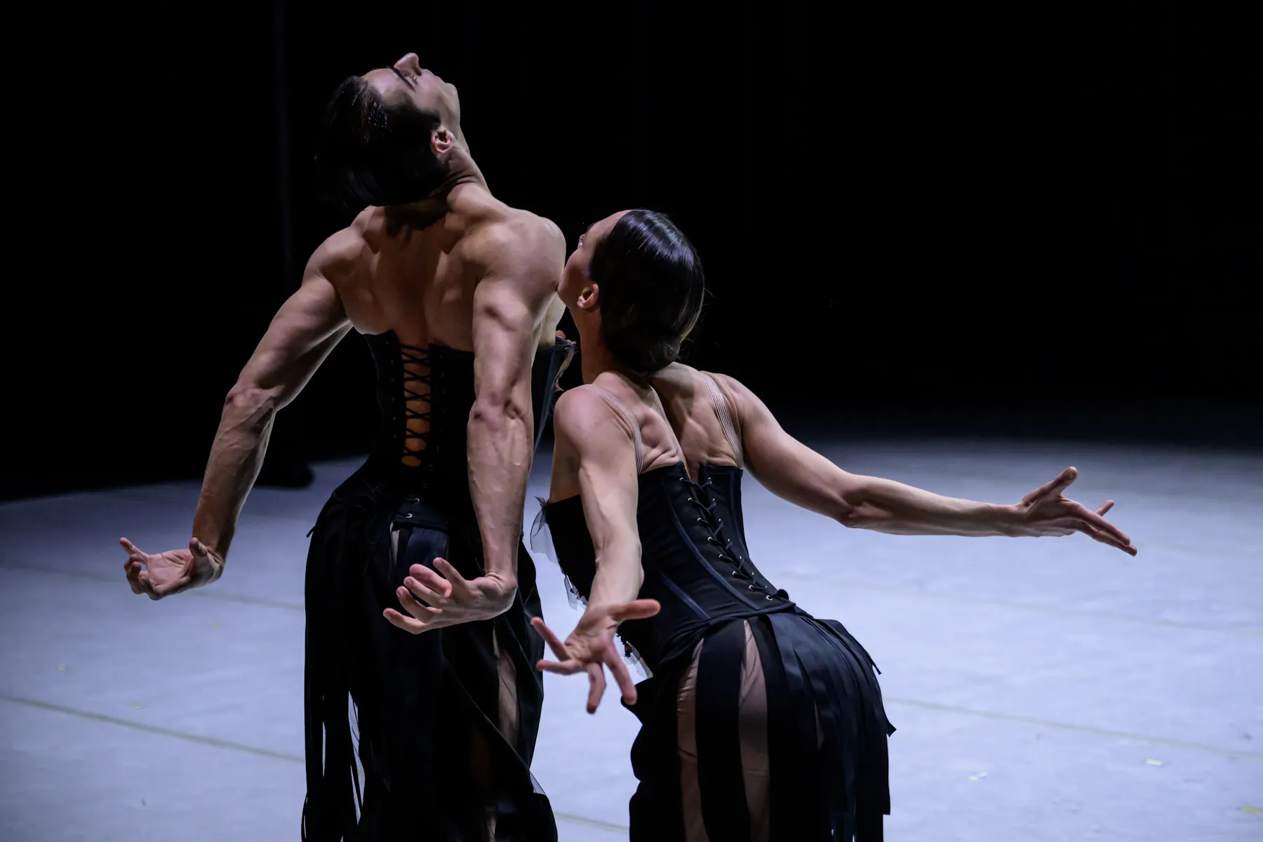 On the opposite end of the spectrum, Avant-Garde is framed by the second world premiere, the choreography Lovebirds by Marc Goecke, an artist whose vocabulary is, in many ways, also somewhat predictable; yet, thanks to his distinctiveness, nervous restlessness, and almost psychopathic essence, he is never boring. Once again, the choreographer relies on a stage shrouded in darkness, legs cloaked in black trousers contrasting with half-naked torsos and arms, on frenetic fluttering, exaggerated grimaces, and almost Tourette’s-like aggressive tics of the upper body—including the head—in the manner of deranged pigeons (or doves, to stay true to the title’s theme). Yet all of this is suddenly complemented by moments of stillness, a seemingly opposing calm, and an almost flowing legato—which would seem soothing in anyone else’s hands, but in Goecke’s case inevitably evokes a chill, paranoid uncertainty, and a sense of electrifying tension before the storm.