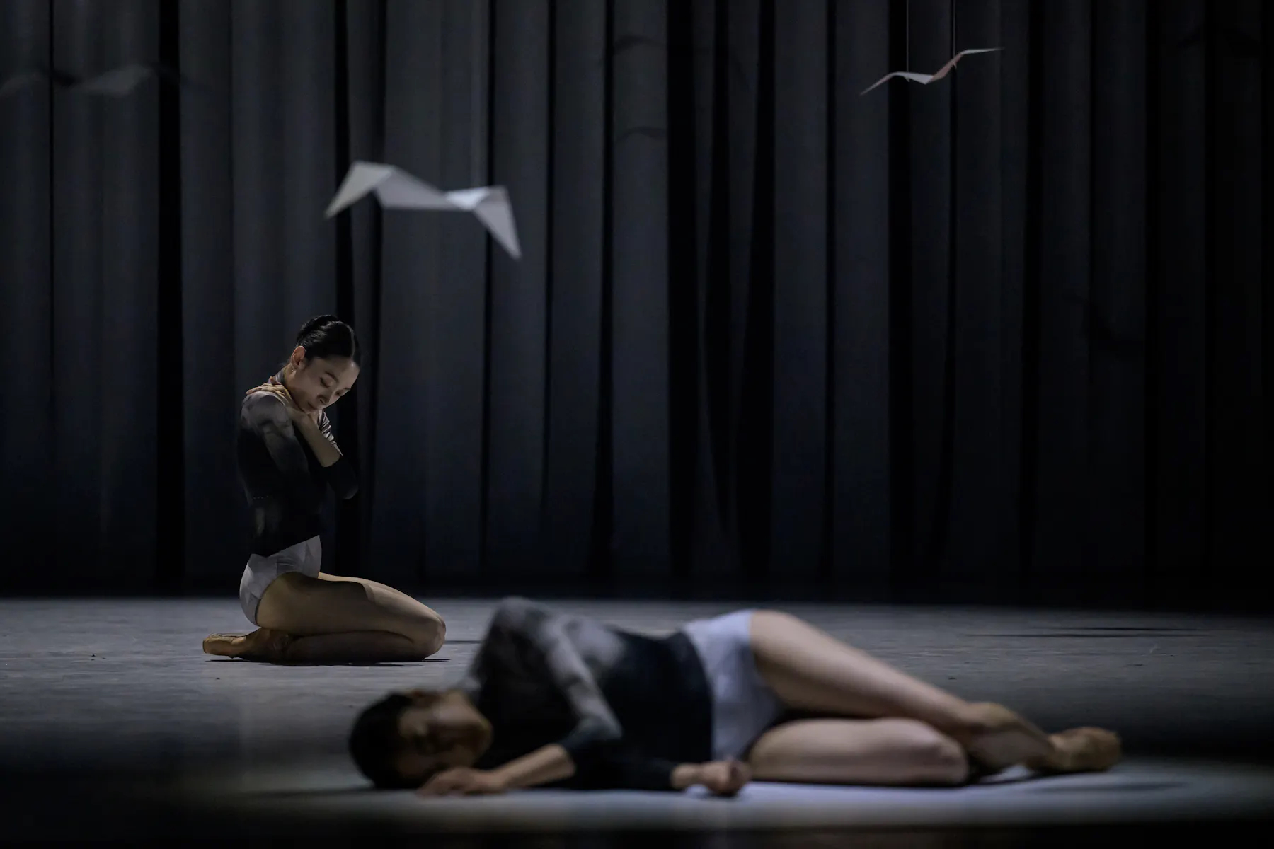 The opening scene itself, in which white paper planes begin to rise above the white stage, feels almost magical and seems to promise a minimalism that would have corresponded with the music. Similarly promising flashes appear in another two or three moments, paradoxically at times when, at first glance, nothing seems to be happening on stage and Bondara eschews the trite, cliché-ridden lifting figures seen a thousand times before, the immediately predictable partnerwork, and allows himself to pause, to simply be for a moment and let the music freely do its work. But that is painfully little, especially when I recall the opening of Autumn, accompanied by the raucous shouting and commotion of the dancers, which I can explain only as a temporary confusion of the senses.