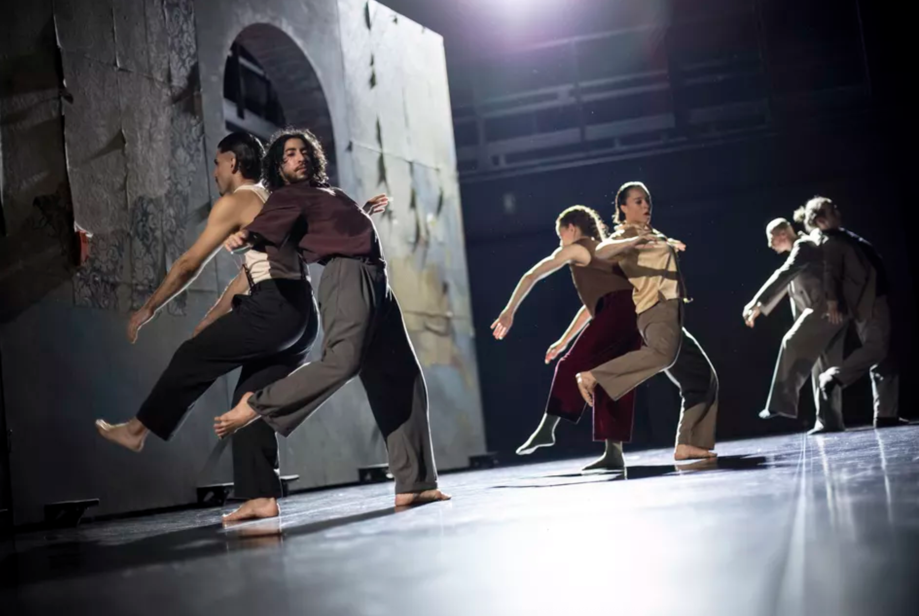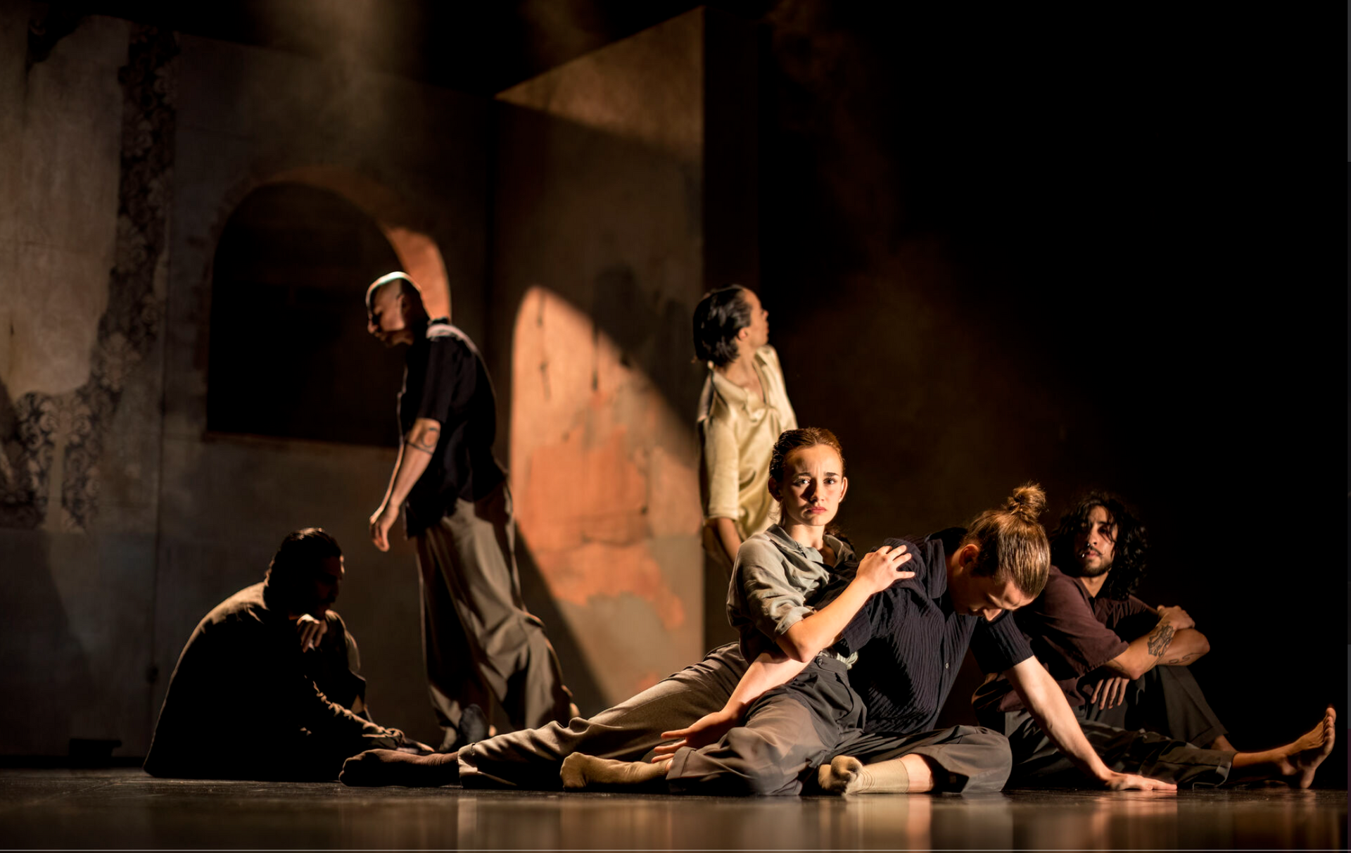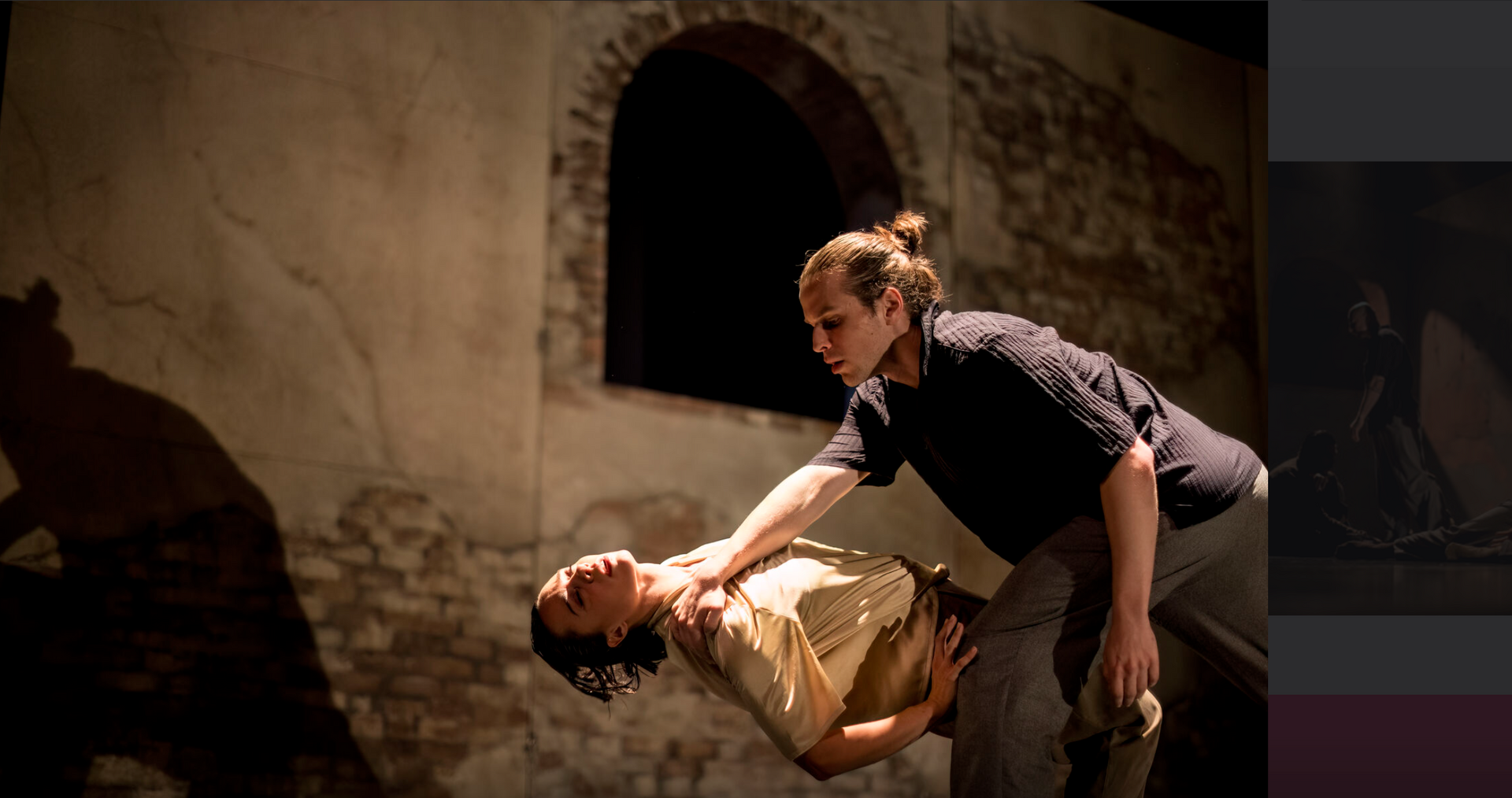 The space and the action are co-created by a movable high wall with a single window. The wall is actually a co-player in the production and determines where we are. It is quite damaged on both sides, with old torn wallpaper and fallen plaster visible. The panel moves across the stage, quickly changing the environment and even creating a closed house. (Although the choreographers designed the set, this is not mentioned in the production credits.)