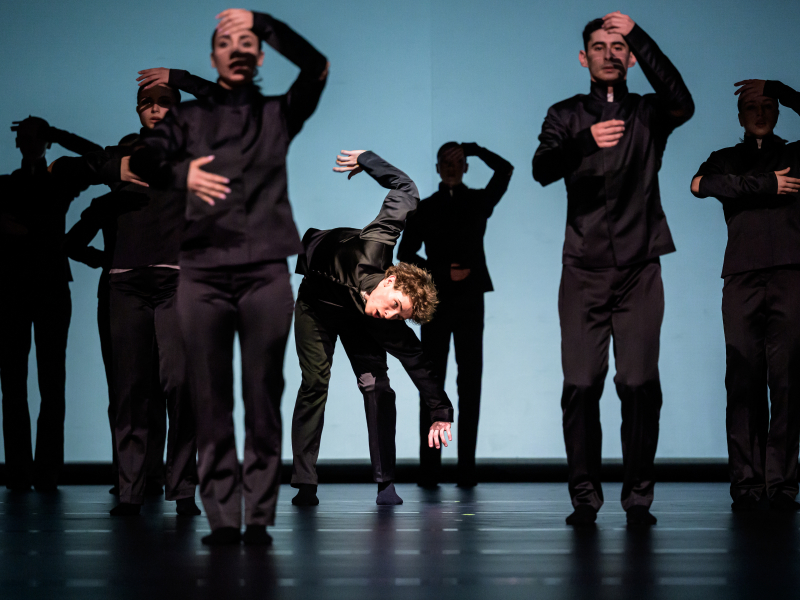 The choreography then features an increasing number of duets—first we see two, then three and four pairs, who subsequently dance in a circle and a spiral. Among them appears the Chosen One, superbly danced by Tom Bellec. A major change also takes place in the costumes by Pavel Knolle. At first, everyone is in black suits, light jackets, and trousers; then in white shirts, with the girls without long trousers. Gradually, the bodies are revealed, transitioning from black to white. Similarly, at the end, a white rectangle of light descends from above, and the stage remains bright. A sense of calm sets in, a metaphor for a paradise. Along with these transformations and the settling of the atmosphere, the original sections of the Requiem—a funeral mass with singing—come to the fore.