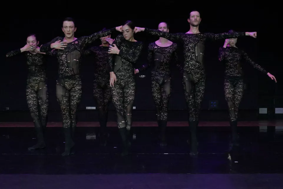 The spellbinding pace of the choreography moves relentlessly forward, artfully supported by the musical score by Koreless. Adding to the impact is the striking make-up (unfortunately the specific name of the make-up artist is not available in the programme) in the form of black paint that resembles the runny black contours of the eyes after a long, hare-brained cry. The dancers' hands are adorned with paintings, apparently an important part of the production according to the program, as it uncharacteristically lists the designer of the nail and jewelry designs, @prettybitchclawss (unfortunately, from a distance, these details blended in with Alon Cohen's very somber lighting, though).