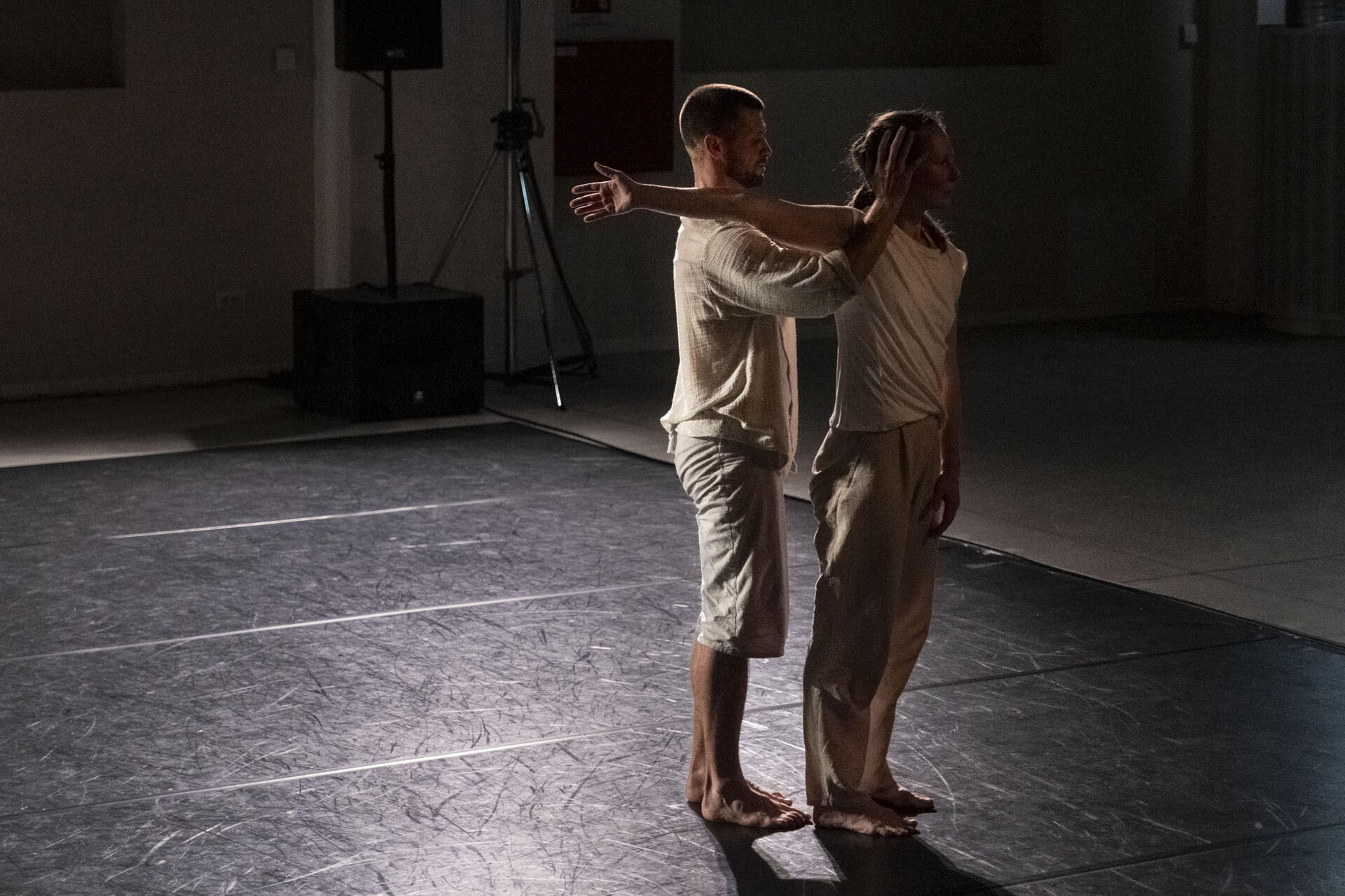 After a one-hour break, as dusk sets, only the glare of the lampposts reverberates in the Daste performance space. For Presencia, the audience set up changes. Now all the seats are on one side, and such frontality is programmatic. To be “present” is indeed “to be before someone,” to manifest yourself to another in reciprocal and bare wholeness, as the two dancers (both in physical presence) in Presencia do to each other through an ongoing superposition of gestures, movements, sensations, and affects as a shared praxis of memory.